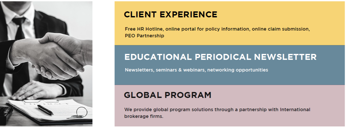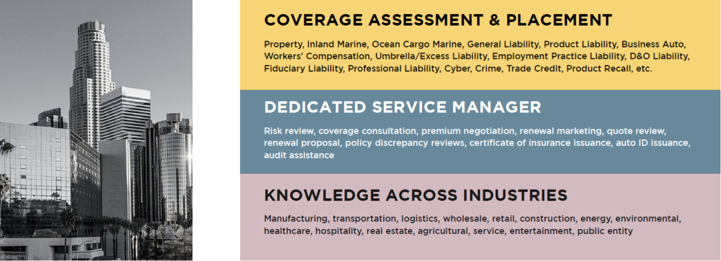 In addition to our traditional brokerage service, we deliver comprehensive risk management services, such as risk consultation, coverage placement, safety compliance, overall risk management advisory, and placement and management of captive insurance programs.